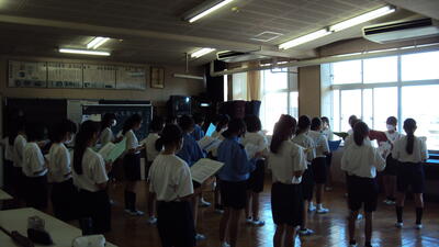 音楽科の先生の指導のもと、全校合唱、学年合唱の練習でした。