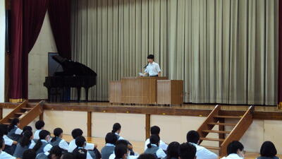 運動部からの、新人戦に向けての意気込み、陸上部、文化部からの応援メッセージ、生徒会本部からの激励があり、大会に向けての気運を高める朝会となりました!運動部の皆さん、ぜひ、部の目標達成目指して頑張ってきてください!