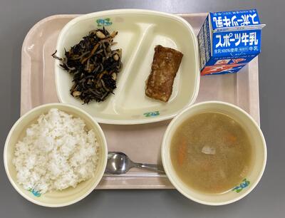 イカの竜田揚げは、薄い衣にもしっかり味がついていて、こんがり揚げ色と相まってイカの旨味と共に口の中にいっぱいに広がりました。ひじきと大豆の炒め煮は、薄めに味付けされたタレにより、名前通りの主役であるひじきと大豆の味を邪魔しないように配慮されていて、素材の味をしっかり味わえました。豚汁は具材も大きく、野菜と豚肉の甘味もしっかり出ていて、おかわりしたくなるほどでした。今日も美味しくいただきました。ありがとうございました。