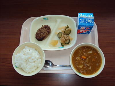 チキンカレーは、主役のチキンとたくさんの具材が入って、ボリューム満点。ごはんがあっという間になくなってしまいました。そして、副菜はハンバーグと、手作り福神漬け。カレーとハンバーグの組み合わせは最高。香ばしく焼き色がついたハンバーグとの相性も抜群です。手作り福神漬けは、食感の良いレンコン、キュウリ。味がしみ込んだ大根は、安定の美味しさです。ゴマのアクセントもおいしさに一役かっています。なんだか、今日はよいことがたくさんありそう。そんな思いにさせてくれるメニューでした。ごちそうさまでした。