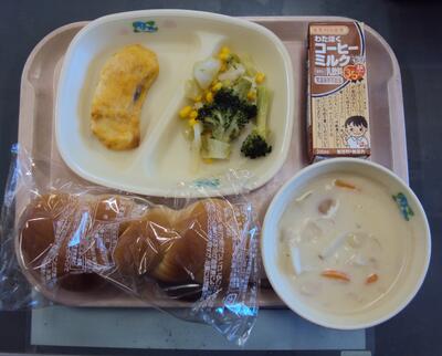 里芋シチューは、その名のとおり、他の具材(ニンジン、玉ねぎ、鶏肉)よりも、大き目にカット存在感あり。さらに、ほどよい塩味で下茹でされたことで、里芋の甘みが口いっぱいに広がりました。ブロッコリーとコーンのサラダは、酸味と塩味のバランスがよく、シチューの甘さを引き立てていました。そこに、ホキピカタのさっぱりとした味付け。味をリセット。一段と寒い今日にもってこいのメニューでした。今日もおいしくいただきました。ありがとうございました。